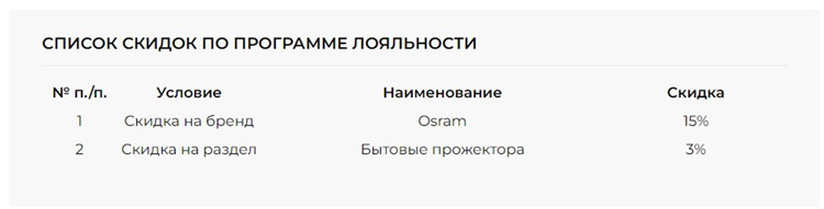 Если вкратце, то программа лояльности для оптовиков работает на основе highload блока, в котором описываются условия предоставляемой скидки для пользователя. На основе этих же условий строятся указания к каталогу на пересчет цен. В визуальном плане, чтобы пользователь всегда был в курсе на какую группу товаров ему предоставлены особые скидки, в отдельную вкладку личного кабинета выводим таблицу.