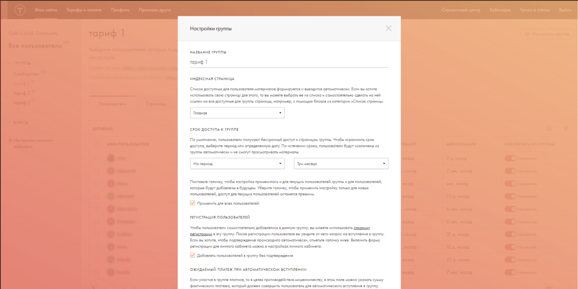 Для удобства управления доступом мы настроили систему тарифных групп. Пользователи автоматически попадали в нужную группу после оплаты, а при окончании подписки доступ закрывался без необходимости ручного вмешательства администратора.