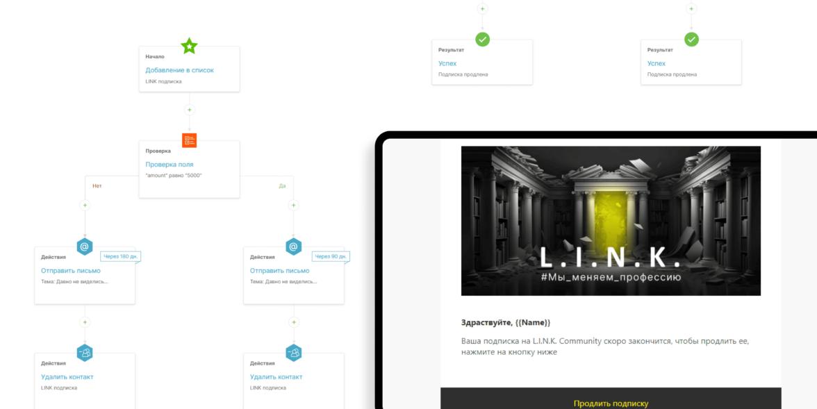 Система оповещений — В Тильде нет встроенной системы уведомлений о продлении подписки, поэтому мы настроили цепочку email-оповещений через Unisender и CRM.