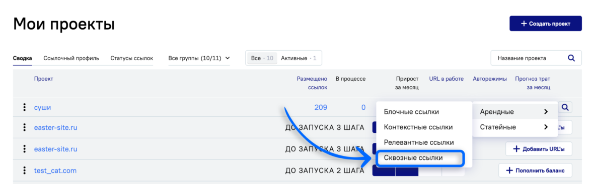 Шаг 1. Создайте в личном кабинете проект или выберите уже имеющийся. В разделе «Мои проекты» нажмите на лупу в правом конце строки с нужным проектом, выберите вкладку «Арендные», затем «Сквозные ссылки» из списка и перейдите на страницу подбора площадок.
