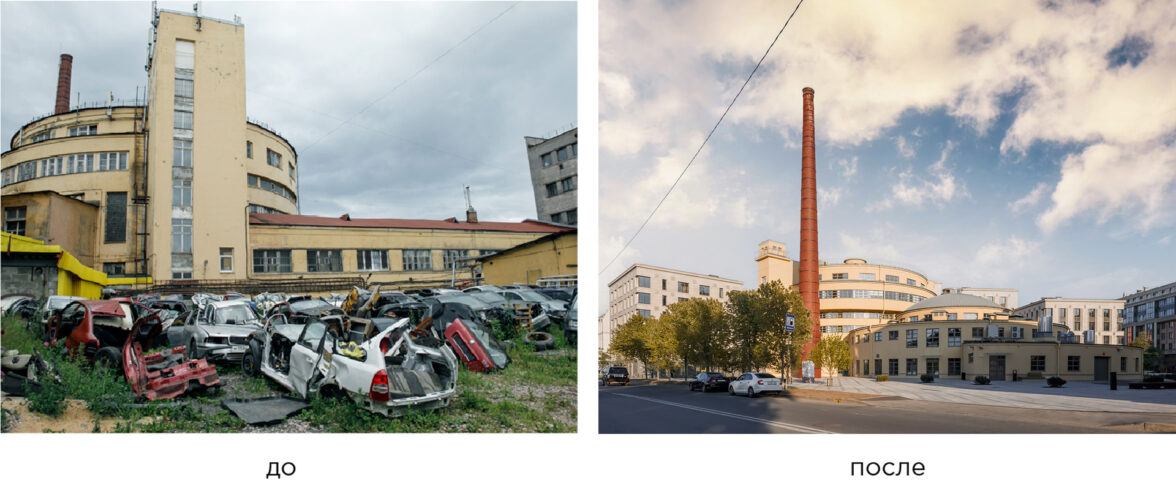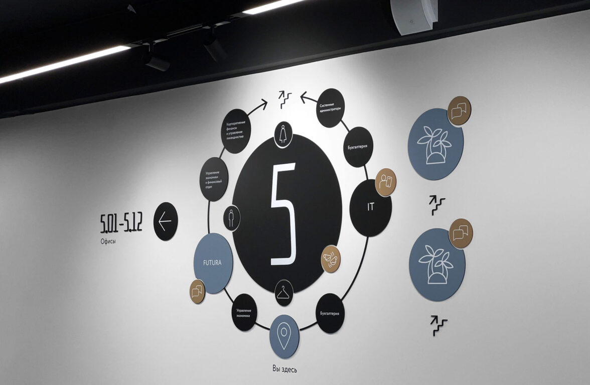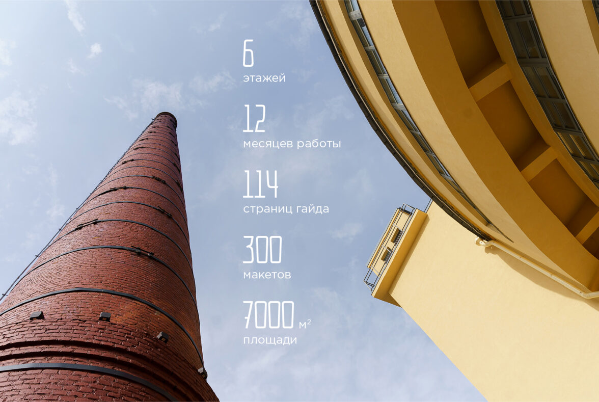 Мы стремились концептуально и стилистически связать навигационное оформление не только с современным видом здания, но и с историей завода — провести символическую линию из прошлого в настоящее.
