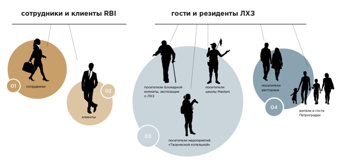 Аудитория хлебозавода делится на четыре большие группы: сотрудники RBI, клиенты RBI, гости и резиденты. У каждой группы посетителей — свои особенности восприятия и точки притяжения при посещении места.
