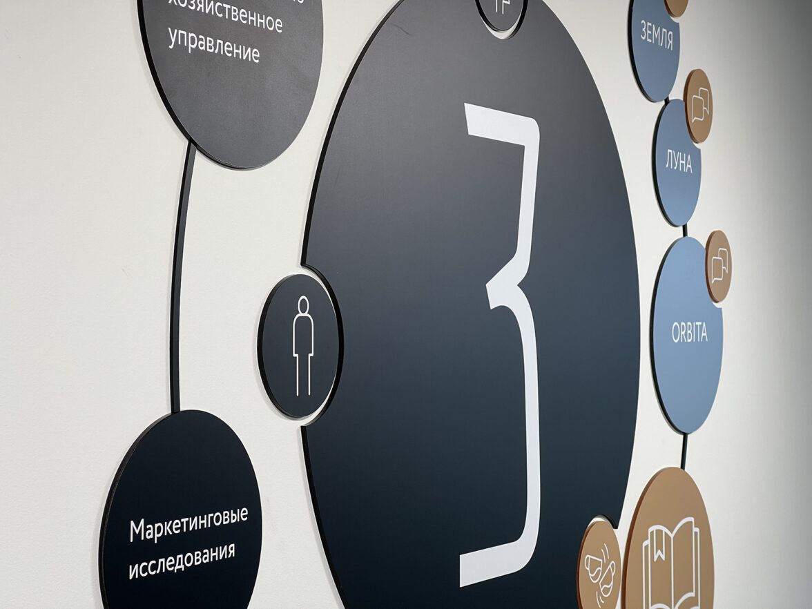Наружными опорными пунктами стали стелы на подъездных путях к зданию и в сквере. Это самый крупный объект навигации — доминанта пространства. Они позволяют сотрудникам и гостям сразу увидеть направление и найти вход.