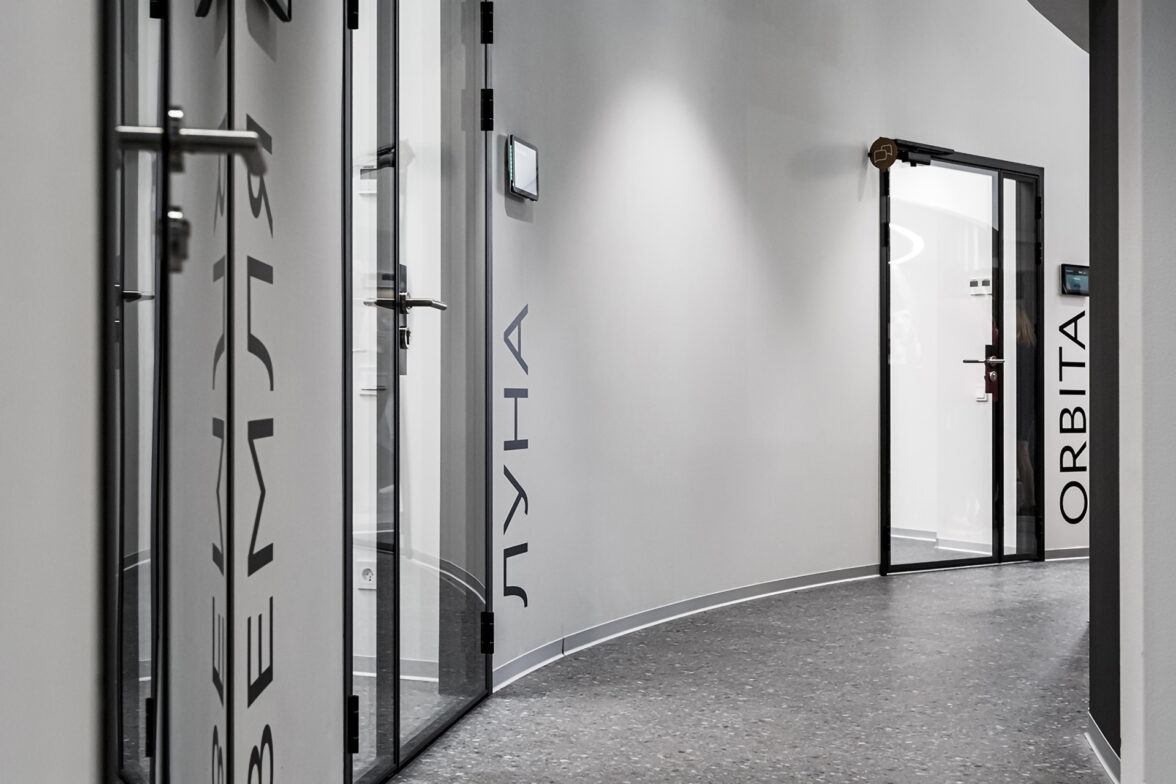 Еще один аспект, помогающий посетителям пространства быстрее ориентироваться, — цветовые решения разводящих указателей. Все офисные пространства мы обозначили черным, а точки притяжения и общественные места — золотым или серо-голубым.