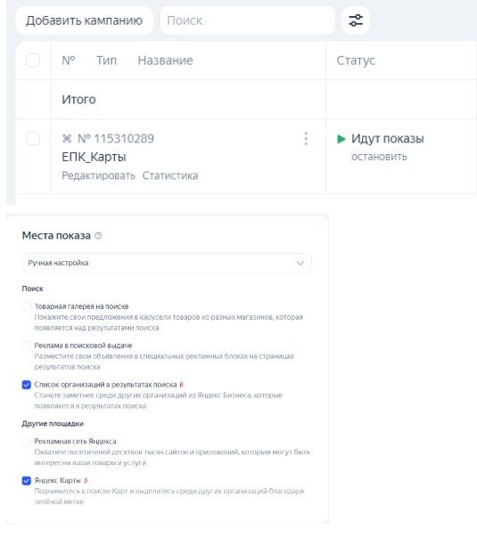 2. В режиме эксперта (ЕПК) откройте «Добавить кампанию» и выберите продвижение на Картах или в списке организаций. Можно подключить обе площадки одновременно, чтобы охватить максимум локальной аудитории.