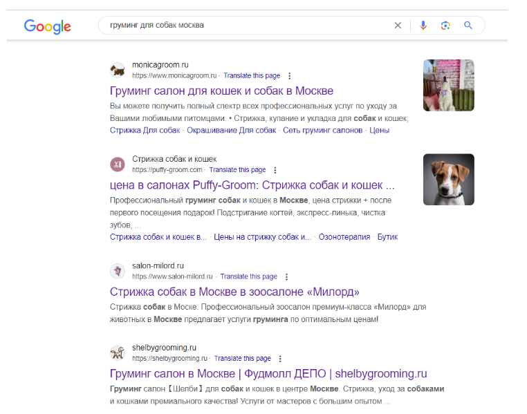 Проработайте структуру ресурса, проанализируйте типы страниц в топе выдачи. Например, по запросам, связанным с грумингом для собак в Москве, в выдаче находятся только главные страницы сайтов. У всех них есть общие признаки, такие, как схема проезда на карте, отзывы и портфолио, а также услуги с ценами прямо на главной странице.