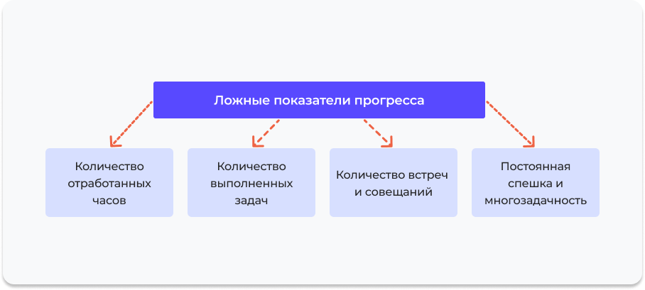 Например, менеджер может провести десять коротких встреч, на которых ничего важного не решили. А может провести одну длинную встречу, где команда нашла решение проблемы, мучившей всех месяцами. В первом случае счетчик «проведенные встречи» покажет большее число, но пользы от этого гораздо меньше.