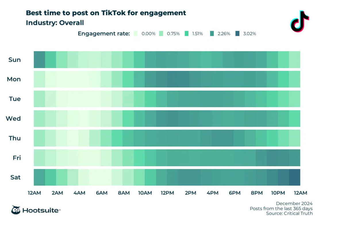 В HootSuite отмечают, что в целом пользователи этой платформы активнее реагируют на контент днем. А лучшее время для публикации в TikTok с целью максимального охвата — это полдень понедельника (с 12 до 14 часов) и ночь с субботы на воскресенье (с 22 часов субботы до 1 часа ночи воскресенья).