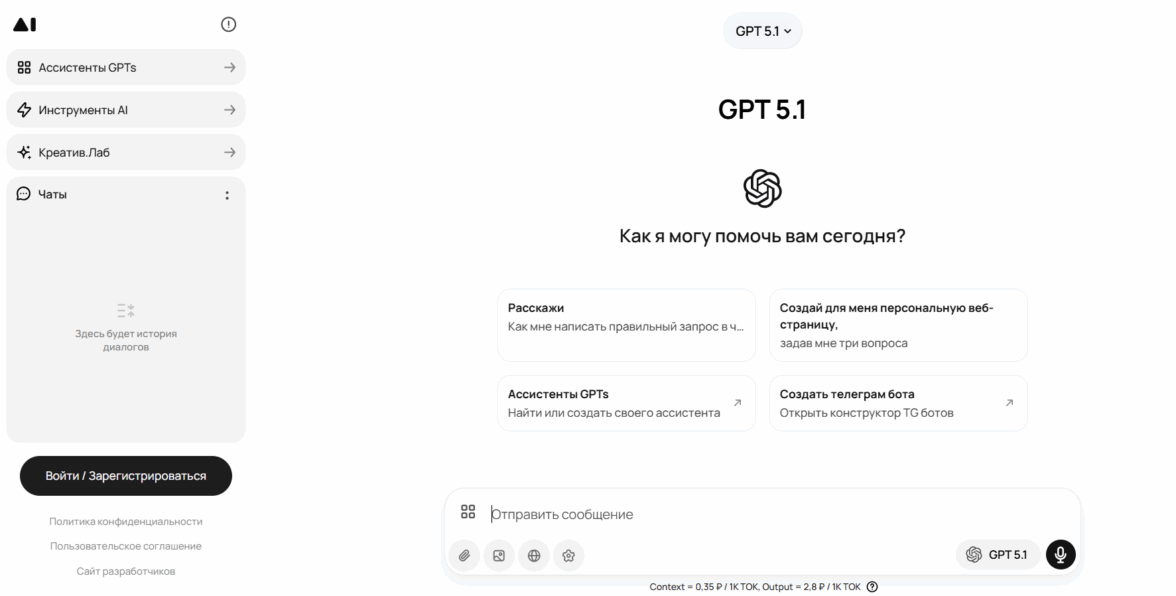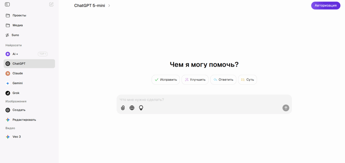 Платформа, дающая доступ к мощным языковым моделям (включая аналоги GPT) через веб‑интерфейс, без использования иностранных карт или зарубежных номеров.С ее помощью можно создавать тексты самых разных форматов — от писем и статей до коммерческих предложений, рекламных копий, описаний и деловой переписки.Платформа иногда позиционируется как «все‑в‑одном»: текст, изображения, генерация контента.