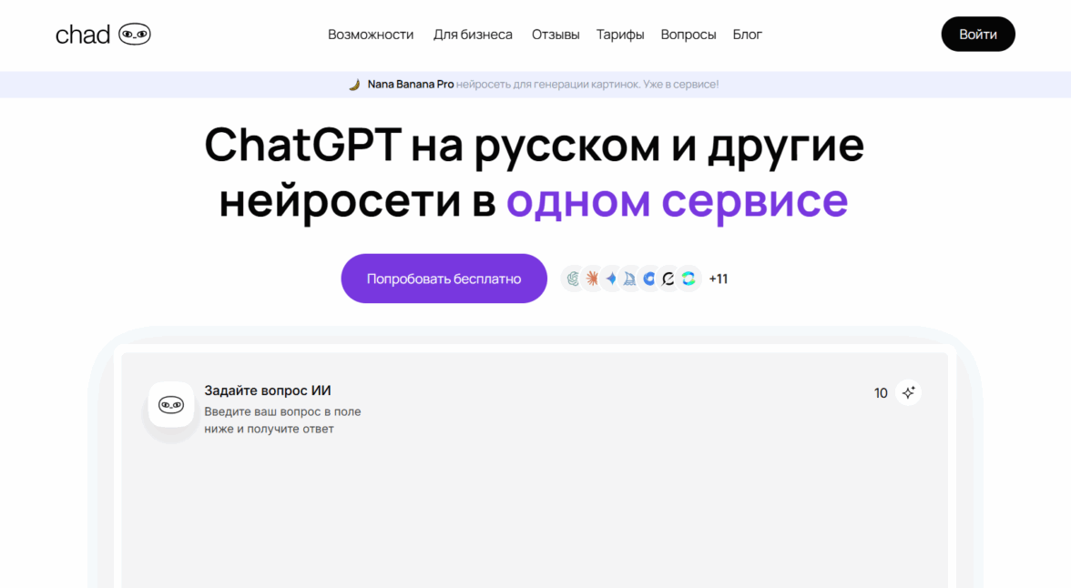 Chad AI — сервис с доступом к современным моделям ChatGPT на русском языке, который помогает писать коммерческие предложения, тексты и код для бизнеса.