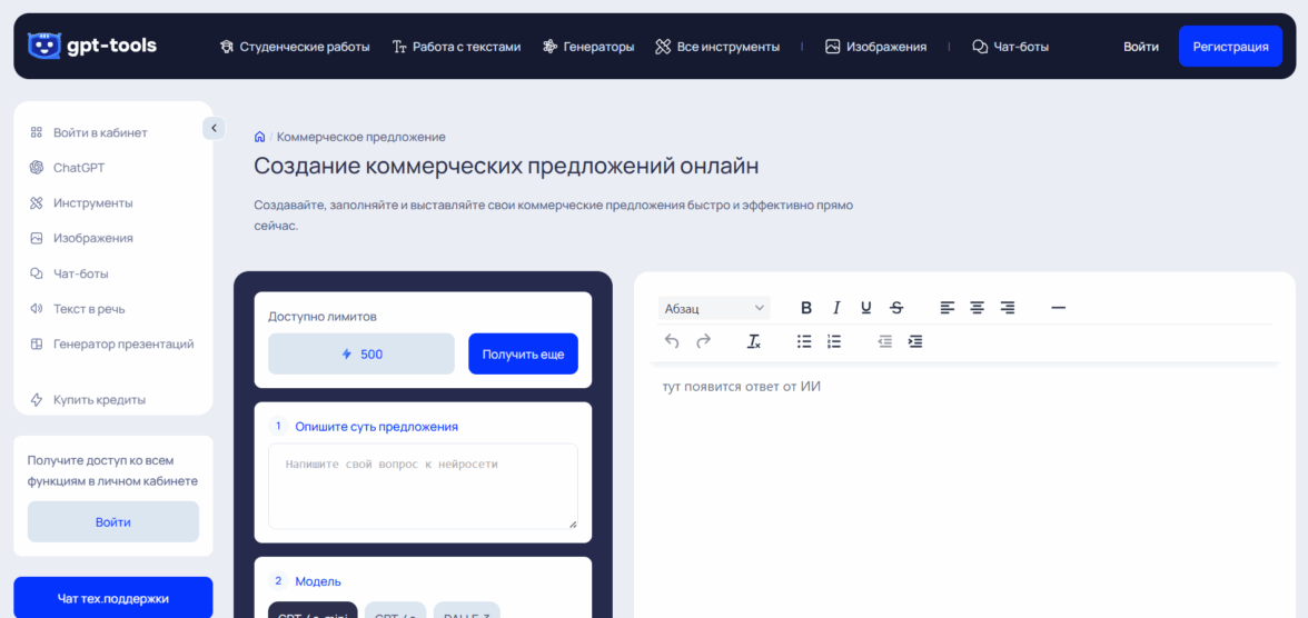 GPT‑Tools — веб‑платформа с инструментами вокруг ChatGPT, где можно генерировать, дорабатывать и форматировать коммерческие предложения онлайн.