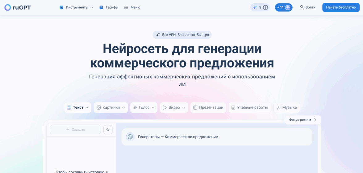 Сервис со встроенной нейросетью для создания коммерческого предложения всего за пару минут. Нужно лишь ввести данные о компании, услуге или товаре, задать цель (например: продажа, партнерское предложение, тендер) — и нейросеть выдаст готовый текст, который можно отредактировать и скачать. Платформа работает в браузере и полностью на русском языке.