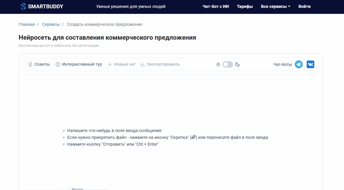 SmartBuddy — платформа с доступом к топовым нейросетям, где можно бесплатно и без регистрации составлять коммерческие предложения и другие деловые тексты.