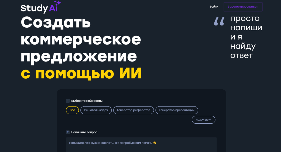 Платформа с ИИ для составления коммерческого предложения: просто задаете параметры — и получаете готовый текст. Сервис предоставляет доступ к передовым нейросетям, и для начала достаточно бесплатной пробной версии без регистрации. Генерация не ограничена по объему текста, что удобно для создания полноценных документов. Эта функция полезна предпринимателям, фрилансерам и маркетологам, которым нужно быстро оформить предложение для клиента.