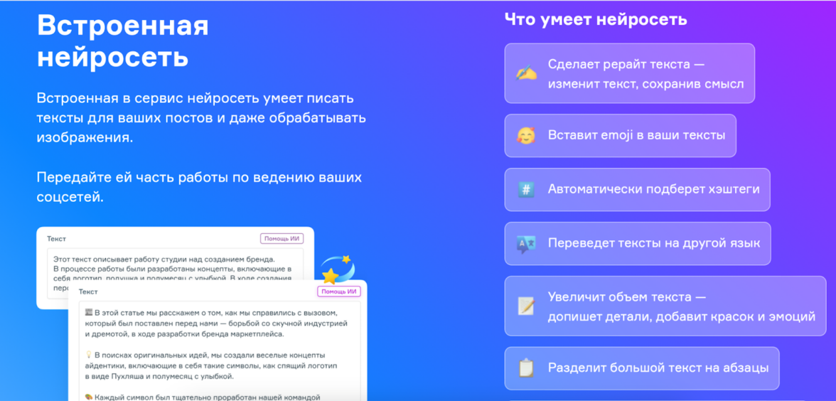 Удобный сервис для автоматического постинга, который не только помогает публиковать посты в социальных сетях. Одна из главных особенностей — возможность поиска контента по ключевым словам, что позволяет вам легко находить идеи для публикаций и следить за трендами. А встроенная нейросеть поможет в создании контента и даже переводе на другие языки.