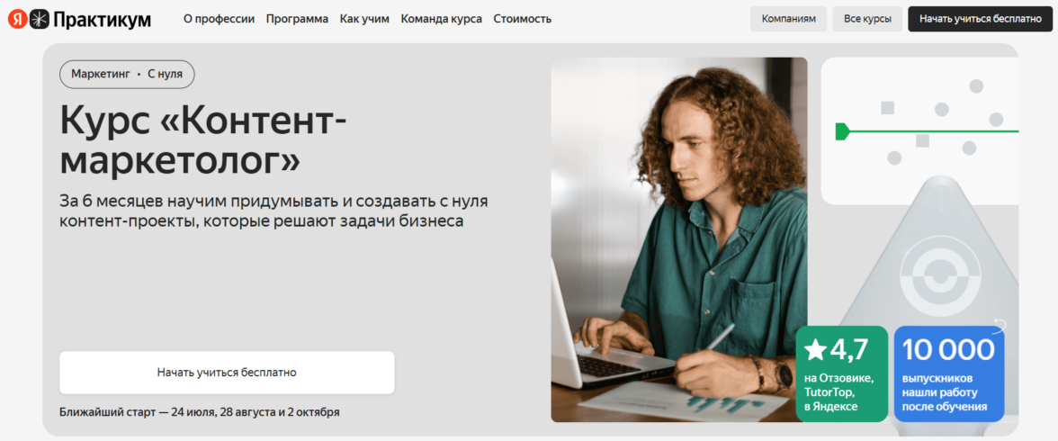 Контент-маркетолог от Яндекс Практикума — возможность заработка спустя два месяца после старта курса.