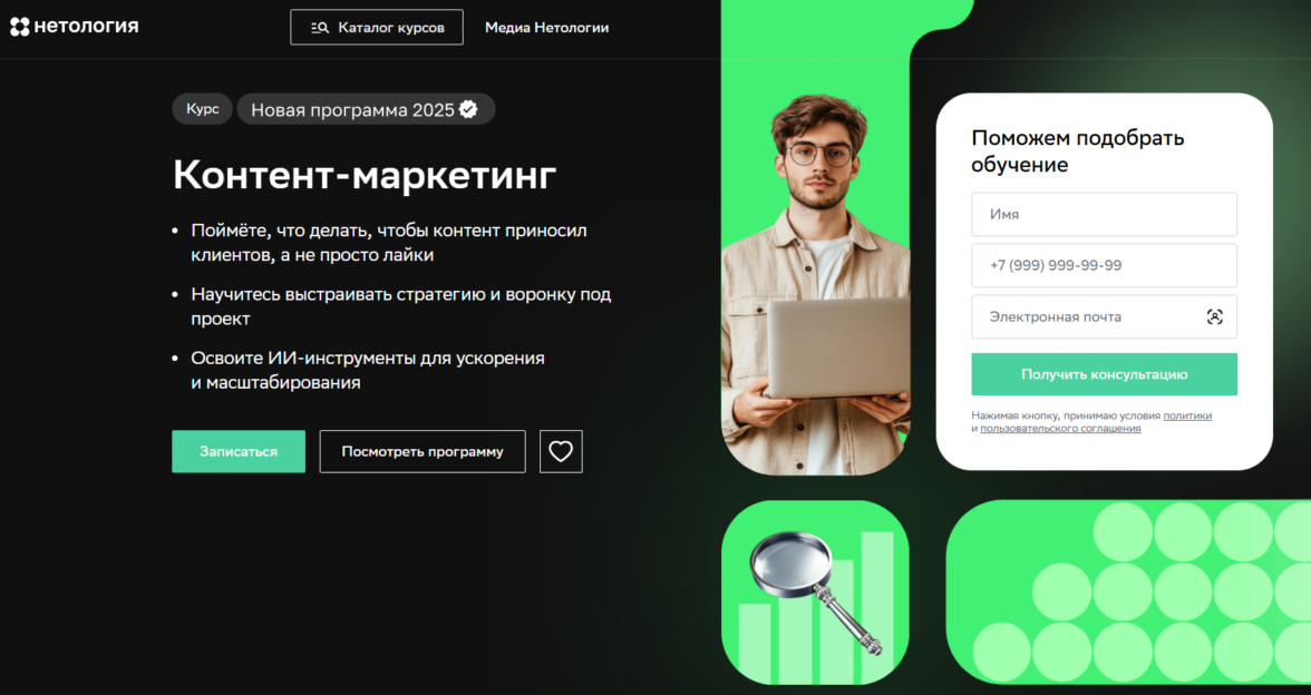 Контент-маркетинг от Нетологии — ускоренное повышение квалификации в области разработки продающих контент-стратегий.