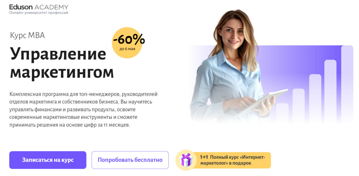 MBA: Управление маркетингом от Eduson Academy — подробный разбор российского и международного подходов внедрения маркетинга в бизнес.