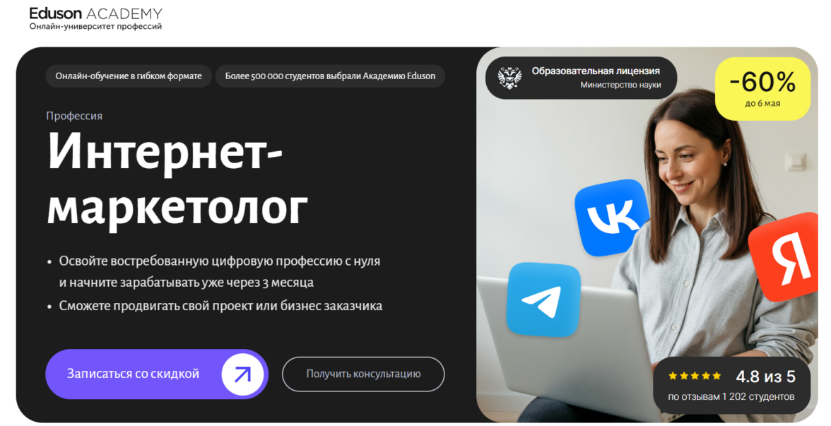 Интернет-маркетолог от Eduson Academy — комплексное изучение актуальных инструментов интернет-маркетинга.