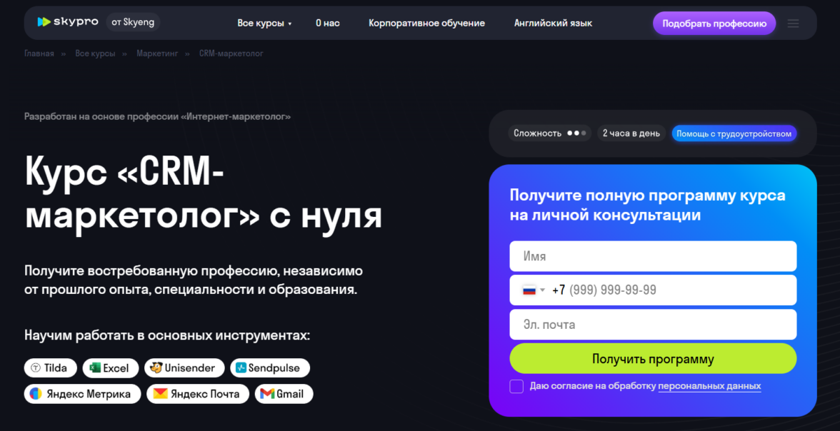 Практико-ориентированный курс, нацеленный на всестороннее изучение профессии CRM-маркетолога и его роли в продвижении бизнеса. За время обучения вы освоите сразу несколько инструментов и сервисов, необходимых для работы: Unisender, Sendpulse, Tilda, Яндекс Метрика, Яндекс Почта и Gmail. Уже к концу курса будете уметь разрабатывать CRM-стратегии с нуля, запускать email-рассылки, реализовывать программы лояльности, создавать контент-планы, проводить A/B-тестирования и анализировать поведение пользователей.