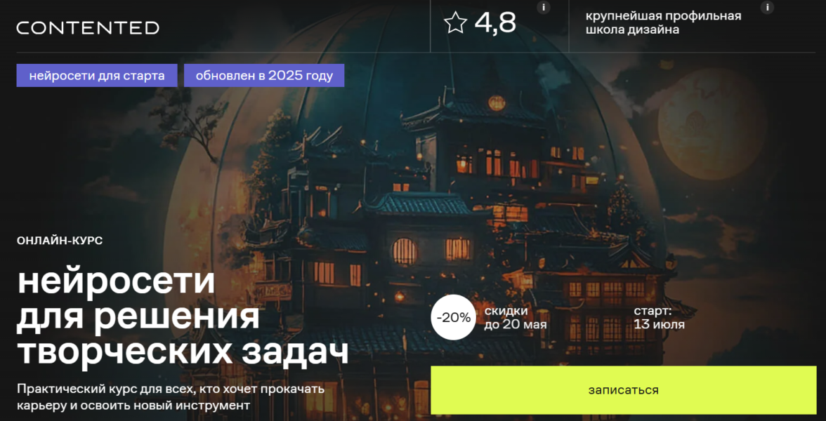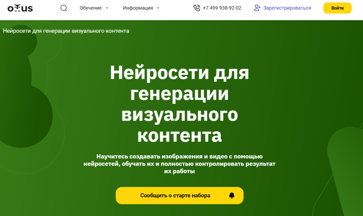 7. Нейросети для генерации визуального контента от OTUS.ru — курс для креативных специалистов по созданию изображений и видео с помощью искусственного интеллекта.