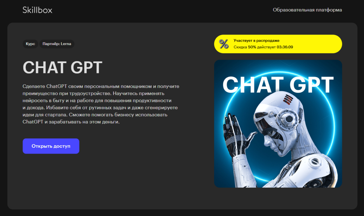 1. ChatGPT от Skillbox.ru — курс для профессионалов по внедрению ChatGPT в рабочие процессы.