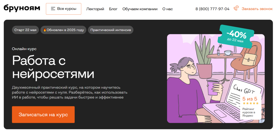 4. Нейросети от принципов к практике от ZeroCoder — интенсивная программа длительностью 2,5 месяца, направленная на освоение практического применения нейросетей. Курс особенно ценен для предпринимателей и профессионалов, стремящихся повысить эффективность бизнес-процессов и масштабировать свои проекты с помощью современных технологий.