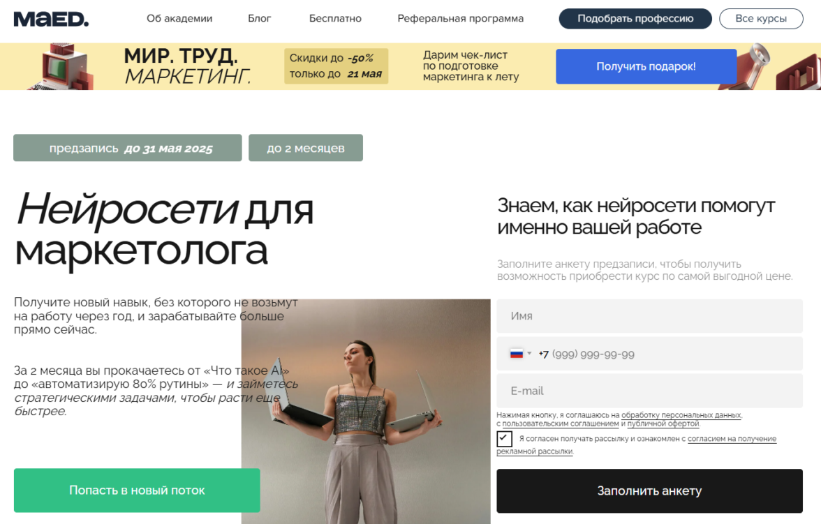 5. Нейросети для маркетолога от MAED — обучение специалистов автоматизации маркетинга и повышению конверсий с помощью AI.