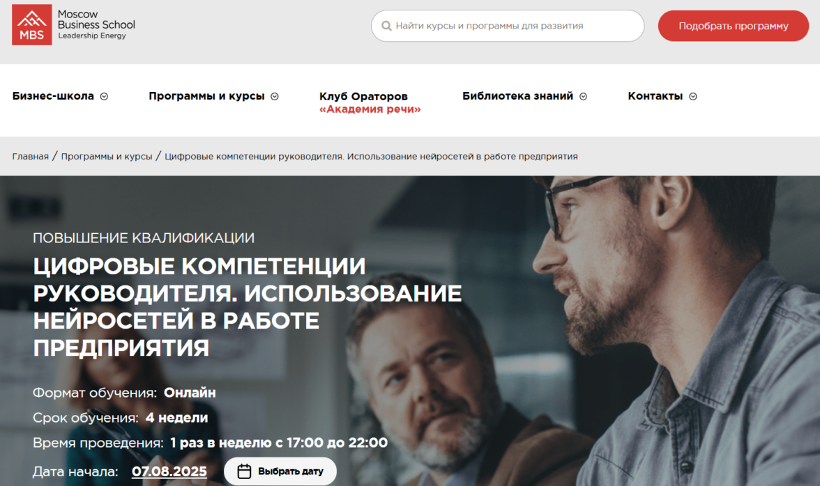 9. Использование нейросетей в работе предприятия от MBS — курс для управленцев о внедрении нейросети в бизнес для повышения производительности.