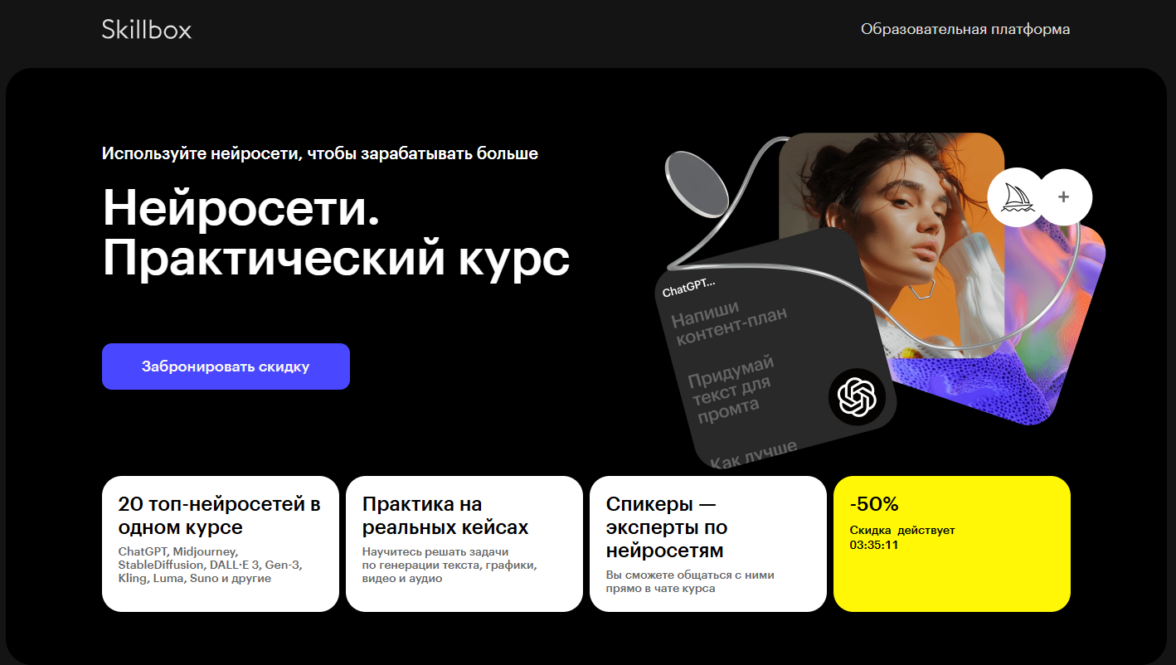 4. Нейросети от Skillbox.ru — программа по интеграции AI в бизнес-процессы и созданию инновационных проектов.