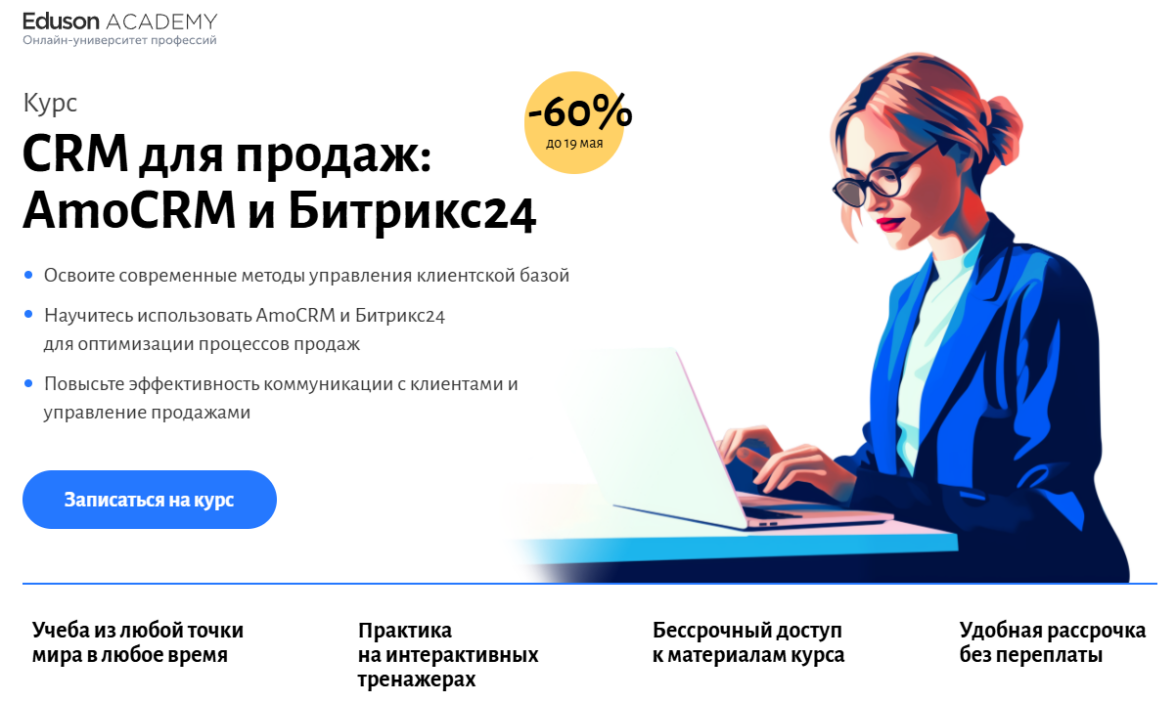 CRM для продаж: AmoCRM и Битрикс24 от Eduson Academy — оригинальный интерактивный тренажер для имитации реальных рабочих программ.
