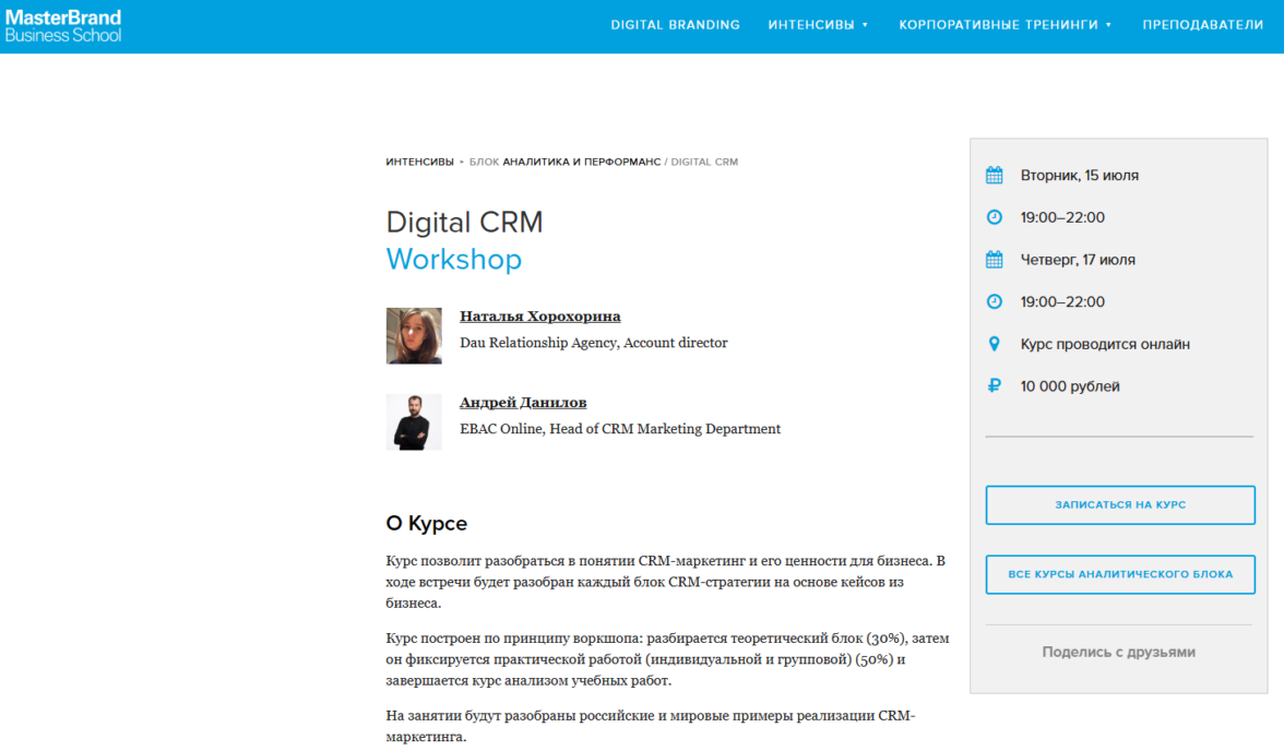 Кому подойдет: программа предназначена для повышения квалификации. Она будет полезна неопытным CRM-маркетологам, а также интернет-маркетологам, осваивающим новые инструменты.