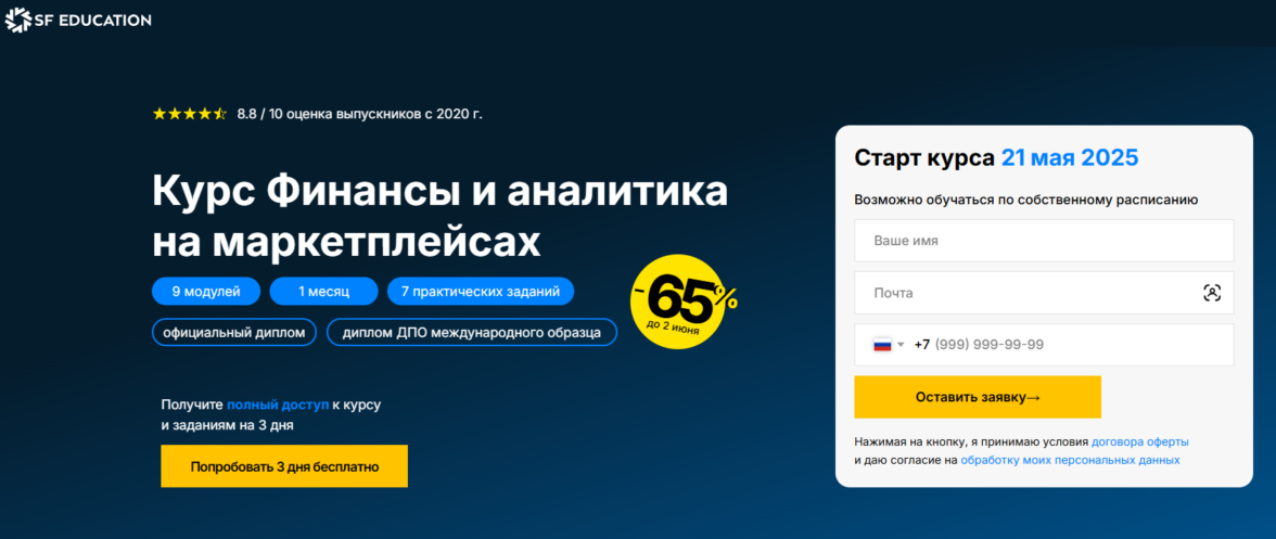 Финансы и аналитика на маркетплейсах от SF Education— лучший курс по маркетплейсам и e-commerce с дипломом международного образца.
