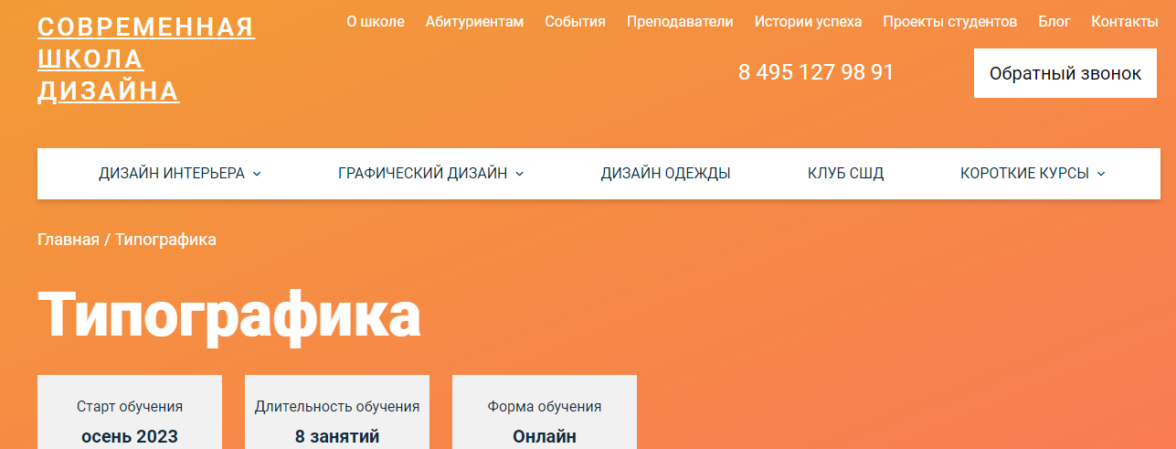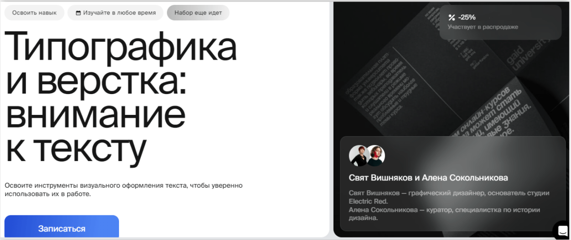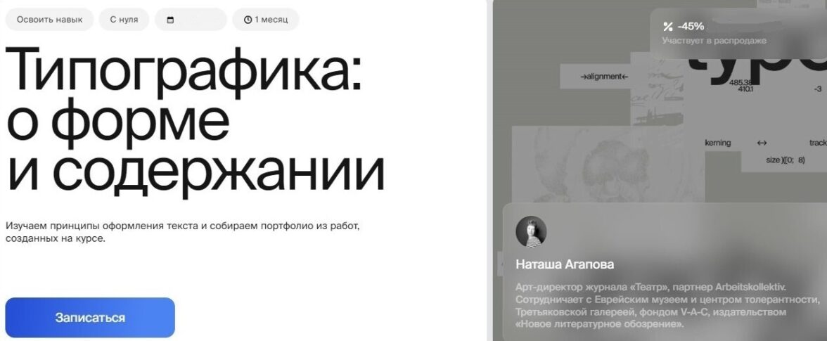 Особенности. Эта программа подойдет начинающим и практикующим дизайнерам. Вы научитесь разбираться в различных видах и типах шрифтов, сочетать шрифтовые пары, подбирать шрифт в зависимости от особенностей проекта. Также курс содержит хорошую программу по основам микротипографики, которая включает изучение длины строки, интерлиньяжа, приводности строк, минускула и маюскула, видов пробелов и других полезных в работе профессионального дизайнера вещей.