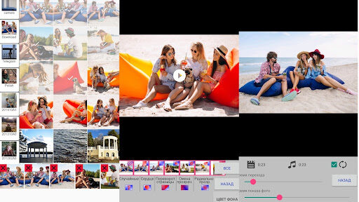 В видеоредакторе удобная навигация и просмотр. Во время выбора исходников в рабочем поле слева отображаются фотоальбомы на телефоне, а справа — содержимое каждой папки.