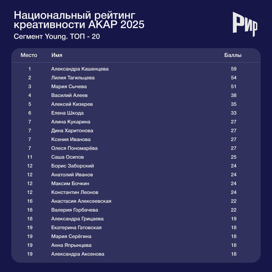 Ассоциация коммуникационных агентств России (АКАР) опубликовала рейтинги креативности и эффективности российских рекламных агентств по результатам побед на фестивалях в 2025 году. Екатеринбургский «Восход» не только пятый год подряд лидирует в рейтинге креативности, но и отвоевал первое место в списке самых эффективных коммуникационных агентств у «Родной Речи». В свою очередь, «Родная Речь» ответила «бронзой» в креативном сегменте, «серебром» в рейтинге эффективности и заняла первое место в сегменте маркетинговых агентств. Самыми талантливыми молодыми креаторами стали Александра Кашенцева, Лилия Тагильцева и Мария Сычева.