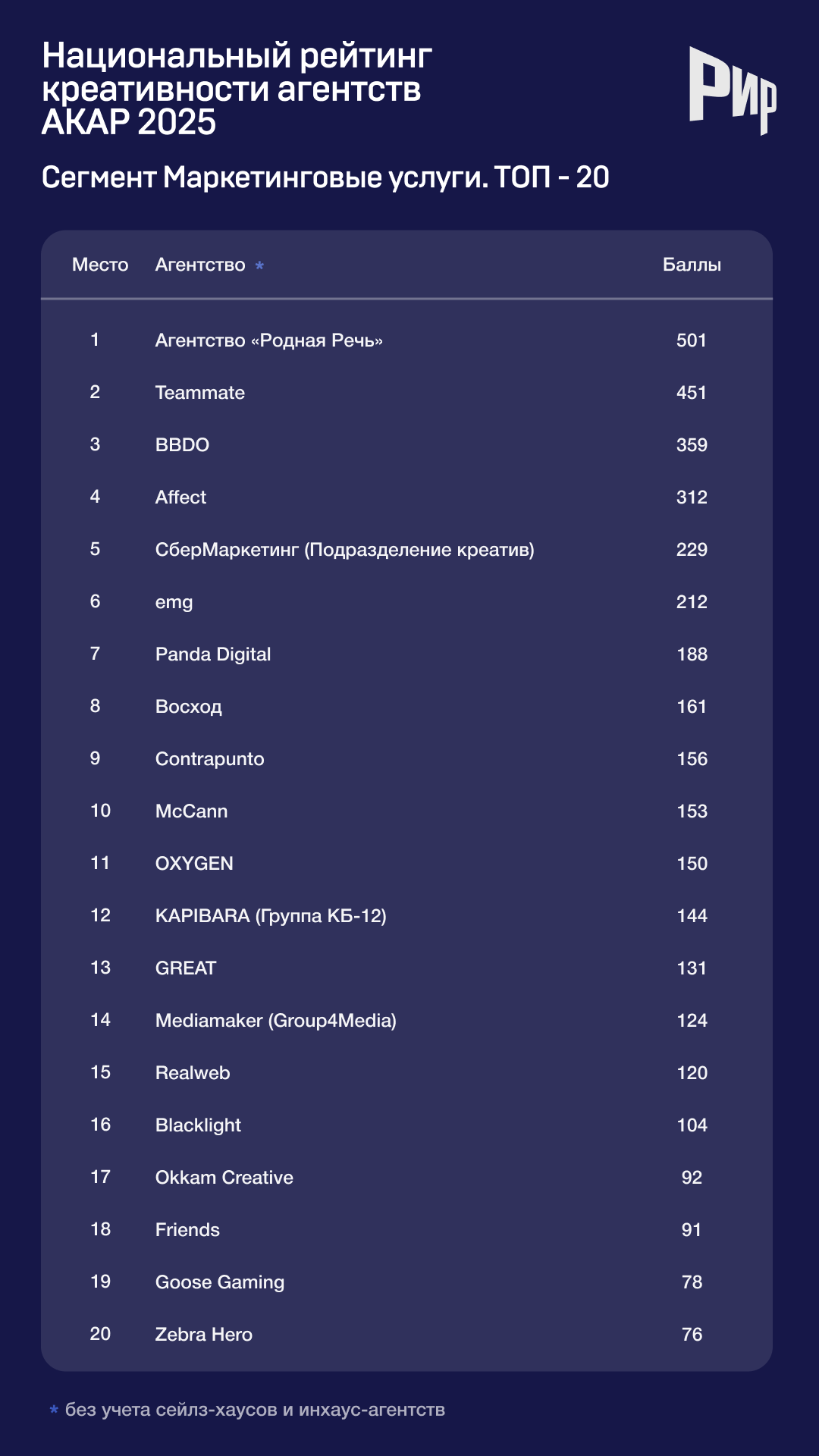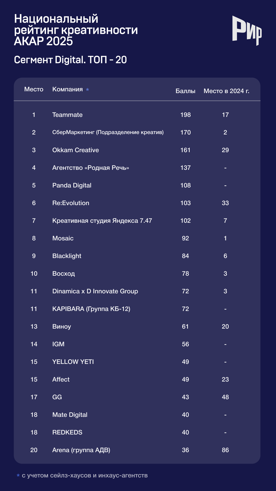 Результаты сегмента «Национальный рейтинг креативности» (с сейлз-хаусами и инхаус-агентствами)