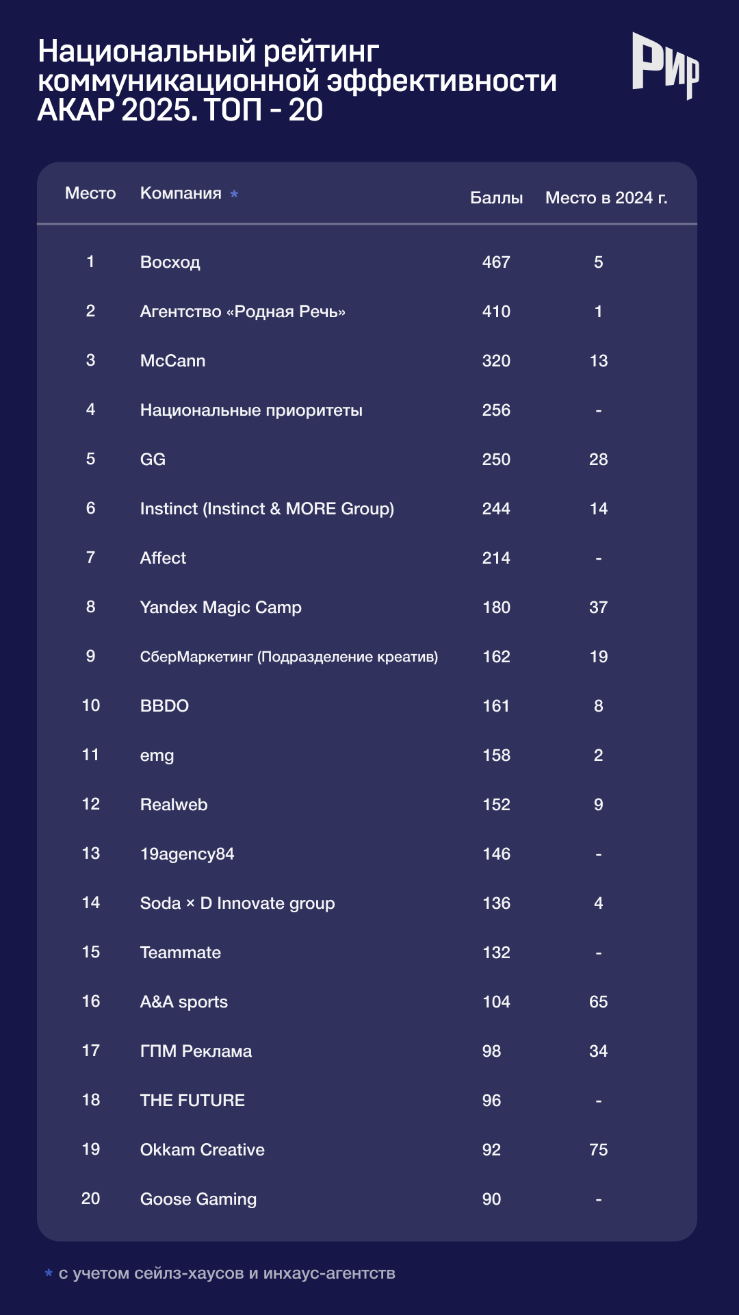 «Восход» в этом году сделал дубль, возглавив не только национальный рейтинг креативности, но и выйдя в лидеры по эффективности. По итогам 2025 года агентство набрало 467 балла. В прошлом рейтинге «Восход» финишировал лишь на 6 месте (266 очков). «Серебро» и 410 баллов в рейтинге эффективности у «Родной речи», которую «Восход» сместил с первой позиции. На третьем месте агентство McCann с 320 баллами. В предыдущем рейтинге оно заняло 16 строку.