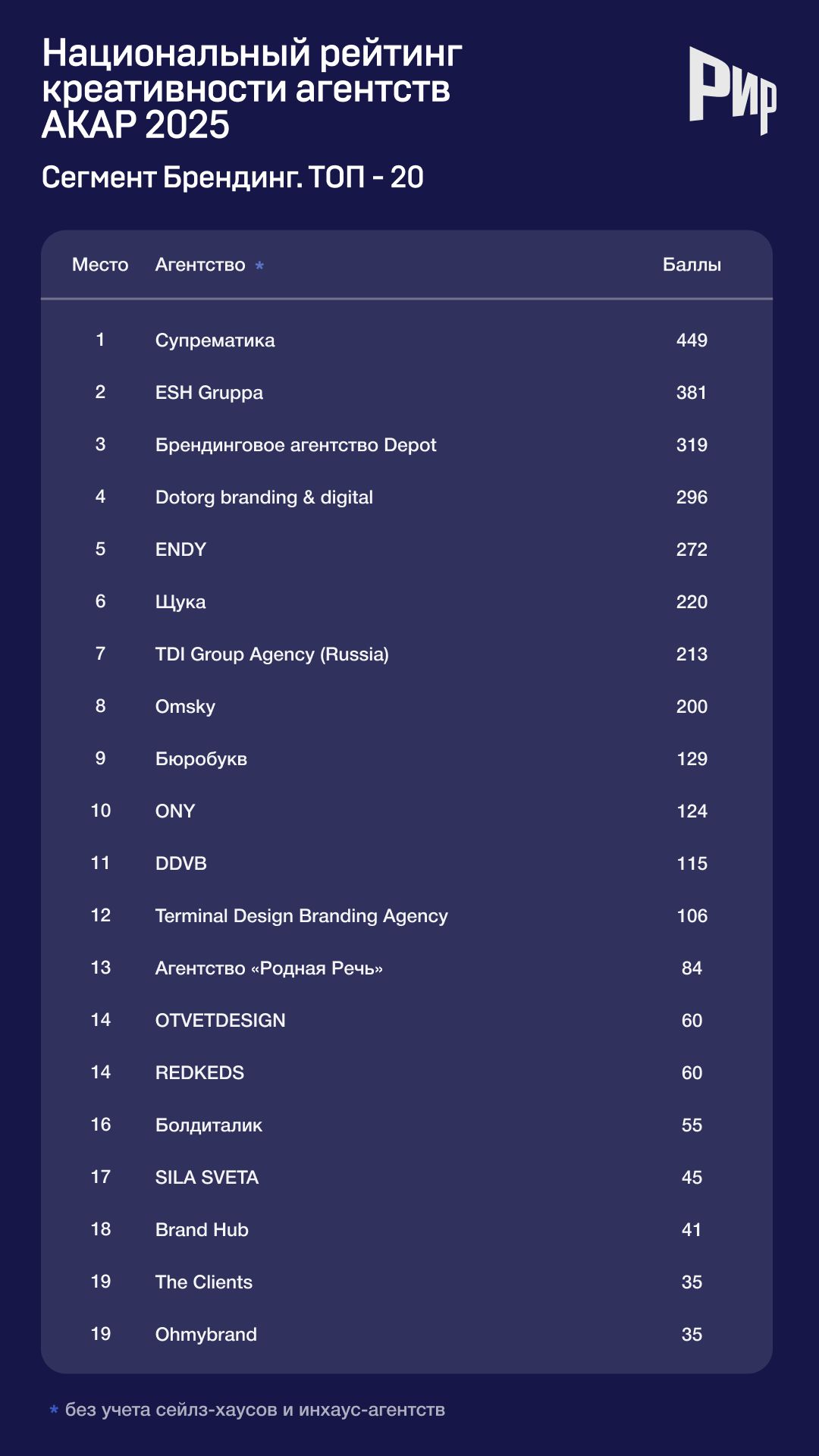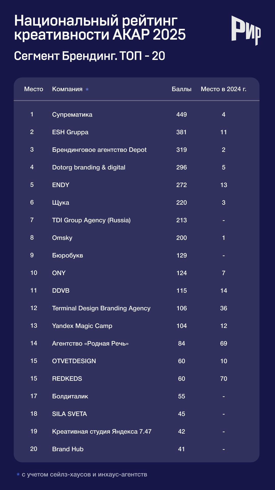 Результаты сегмента «Брендинг» (с сейлз-хаусами и инхаус-агентствами)