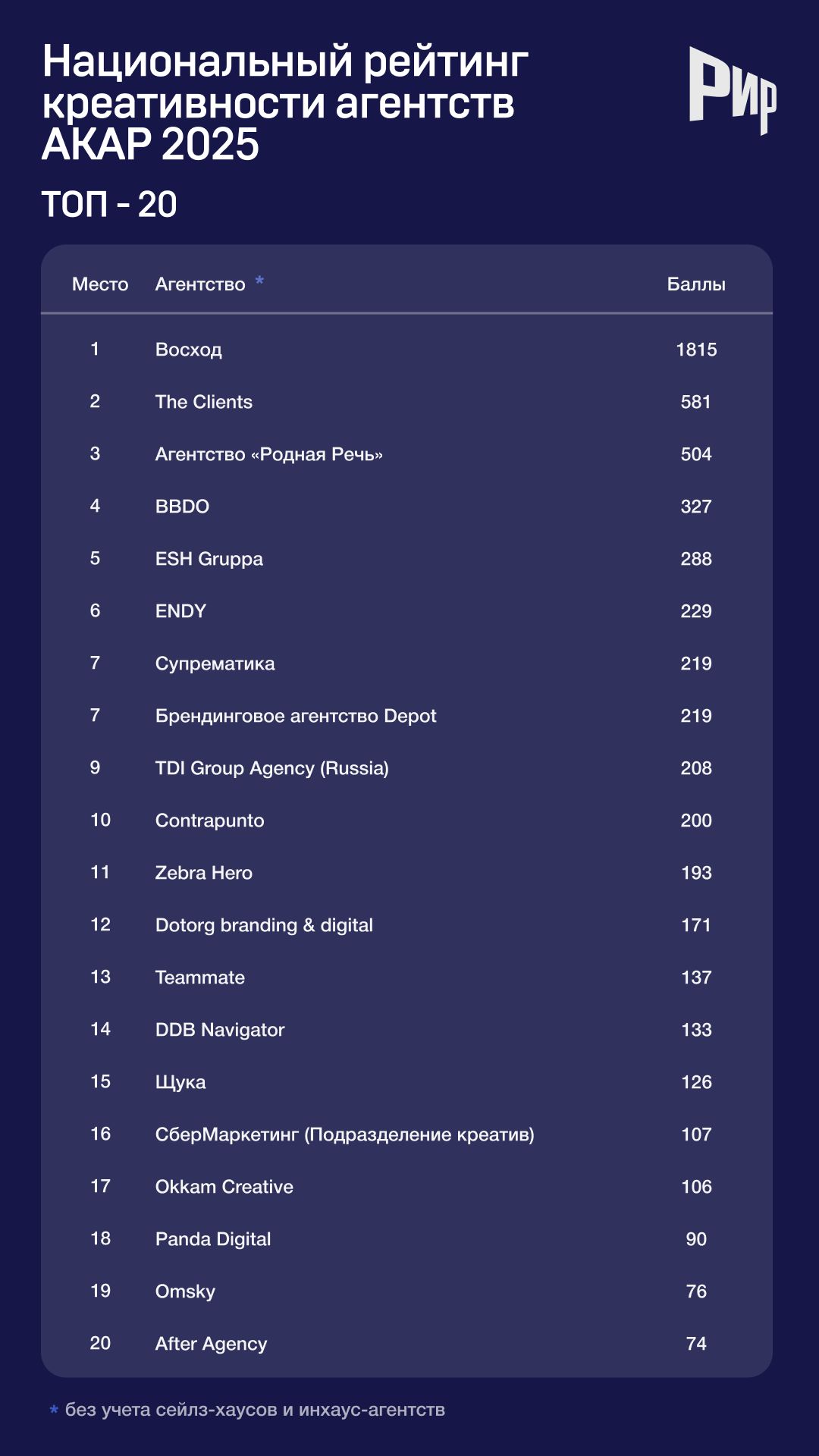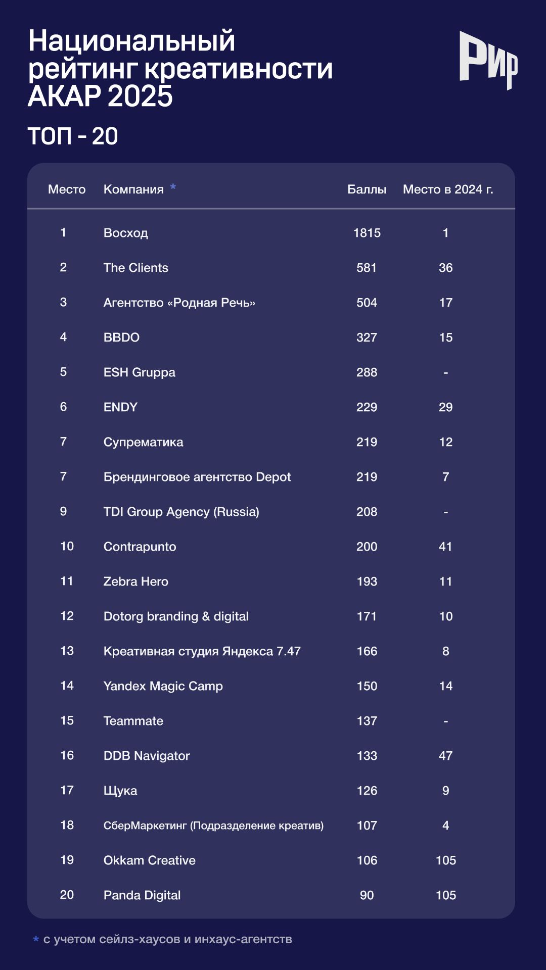 «Восход» пятый год подряд удерживает первое место в рейтинге креативности АКАР. В этот раз агентство набрало рекордные 1815 баллов — ровно в два раза больше, чем год назад. На втором месте агентство The Clients с 581 фестивальным баллом. В прошлом рейтинге The Clients занимало лишь 36 строчку с 36 баллами. «Бронза» у «Родной речи», которая в четыре раза увеличила количество набранных баллов — 504 вместо 119-и в предыдущем рейтинге.