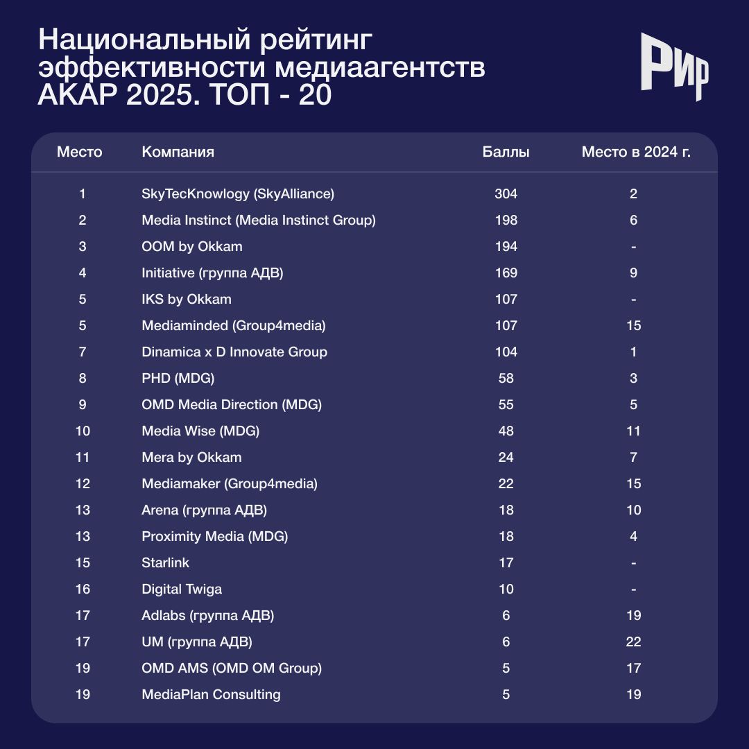 Из прошлогодних победителей в рейтинге медиаагенств остался лишь один участник — агентство SkyTecKnowlogy — и в этом году он поднялся со второго на первое место с результатом 304 балла. Оставшиеся места в тройке лидеров разделили агентство Media Instinct (198 баллов) и OOM (194 балла). В прошлогодней итерации рейтинга Media Instinct был шестой, а OOM не вошло в число номинантов.