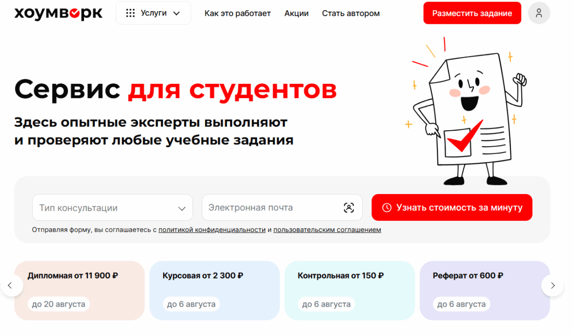 Российский сервис для выполнения разного рода студенческих работ. Площадка ждет не только заказчиков, но и авторов, способных подтвердить свою компетенцию. Схема проста: заказчик размещает на платформе задание, исполнители предлагают потенциальную стоимость, и заказчик выбирает автора. После принятия работы исполнитель получает оплату. Чтобы выбрать специалиста, можно изучить его резюме, рейтинг и подтвержденные компетенции. За подписку на рассылки можно получить секретную скидку.
