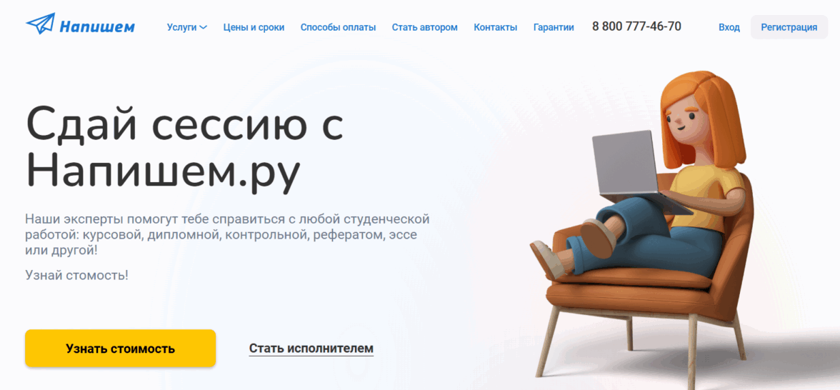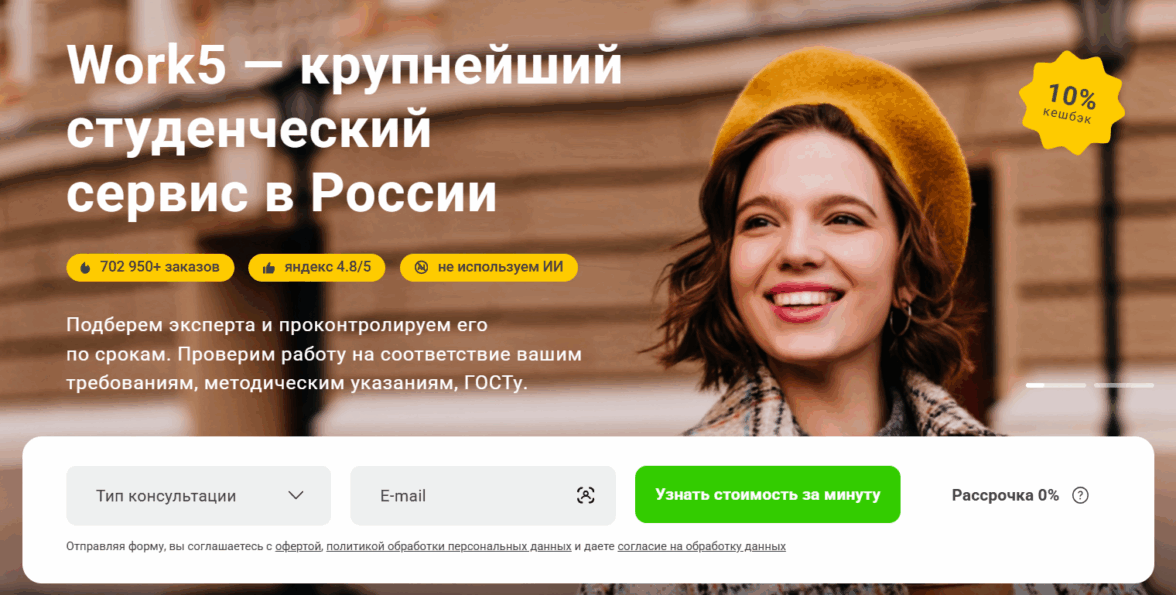 Это один из крупнейших на территории России студенческих сервисов с большим опытом работы. Помимо стандартных услуг компания помогает с аннотацией, мотивационным письмом, тезисным планом, решением примеров и кейсов. Изначально оплачивается 25 % от стоимости работы, оставшиеся 75 % — по итогу последней консультации. Срочную работу необходимо оплатить сразу. Среди способов оплаты кроме банковских карт и платежных систем возможна оплата наличными по адресу офиса-филиала.