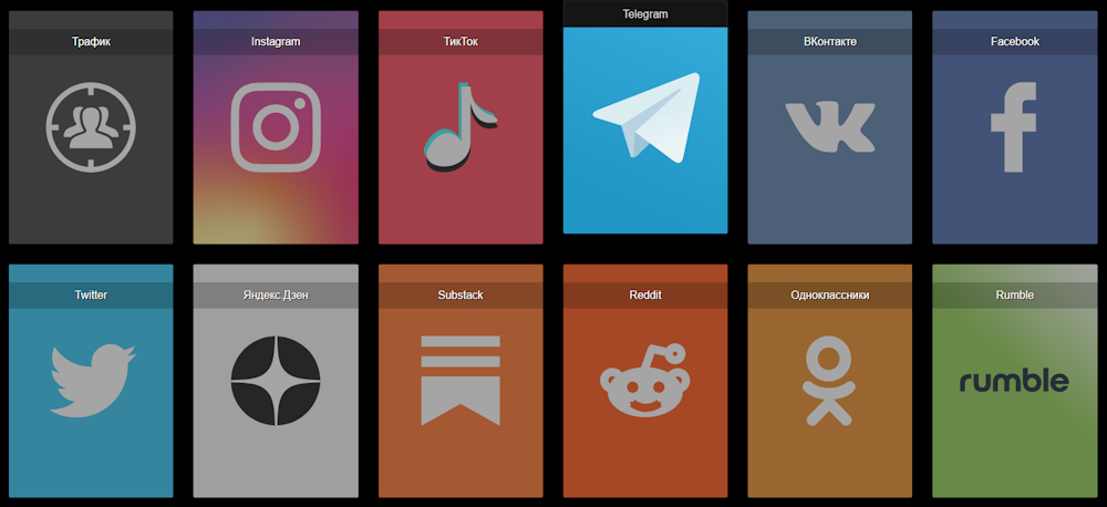 • накрутка зрителей и подписчиков, а также разных видов их активности — причем не только на Твич, но и таких площадках, как VK, Telegram, Дзен, RuTube и др.;