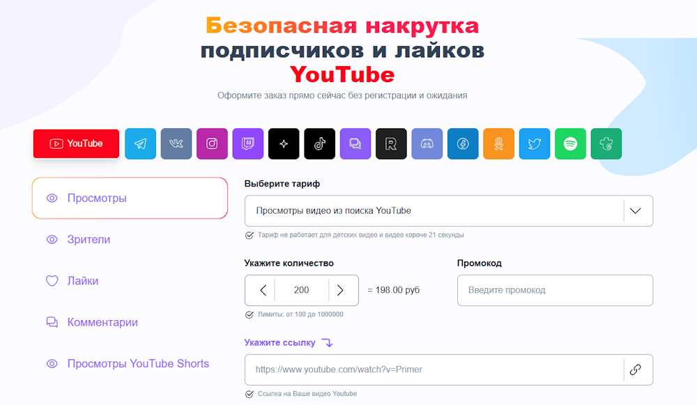 Но главное, чем выделяется данный сервис — бесплатная раскрутка, которая доступна всем пользователям. Если накрутка нужна небольшая, то этой опции может быть достаточно. А также, чтобы заказать продвижение, можно не проходить регистрацию: все покупки совершаются прямо на главной странице площадки, и на это уходит пара кликов.