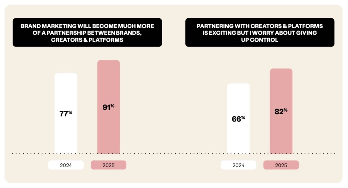 Процент опрошенных, согласившихся со следующими утверждениями. Слева — «Бренд-маркетинг все больше превращается в партнерство брендов, контент-креаторов и платформ». Справа — «Партнерство с контент-креаторами и платформами захватывающе, но я беспокоюсь по поводу возможной потери контроля».