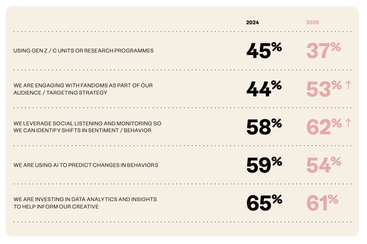 Процент опрошенных, принимающих следующие меры, чтобы опережать изменения потребительского поведения (сверху вниз): используют программы исследования поколения зумеров и клиентоориентированного подхода «4с»; коммуницируют с фандомом в рамках стратегии таргетинга аудитории; прислушиваются к коммуникации в соцсетях для идентификации сдвигов в поведении и настроении потребителей; используют ИИ для предсказания изменений в поведении; инвестируют в аналитику и анализ данных, что помогает креативной деятельности.