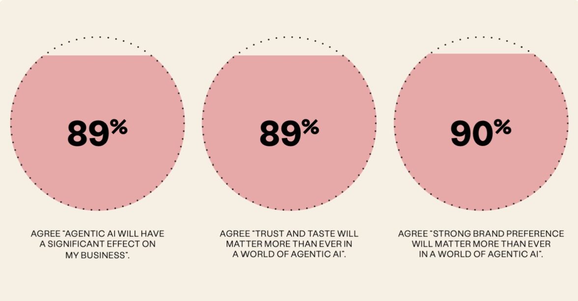 Процент опрошенных, согласившихся со следующими утверждениями (слева направо): «Агентный ИИ будет оказывать значительное влияние на мой бизнес»; «Доверие и вкус будут значить больше, чем когда-либо, в мире агентного ИИ»; «Сильное предпочтение бренда будет значить больше, чем когда-либо, в мире агентного ИИ».