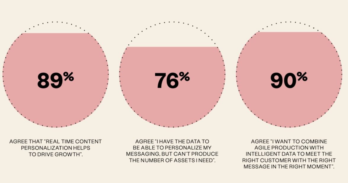 Процент опрошенных, согласных со следующими утверждениями (слева направо): «Персонализация контента в режиме реального времени способствует росту»; «У меня есть данные, позволяющие персонализировать месседж, но я не могу создать необходимое число активов»; «Я хочу комбинировать гибкое создание продукта с умными данными, чтобы направить правильному покупателю правильный месседж в правильное время».