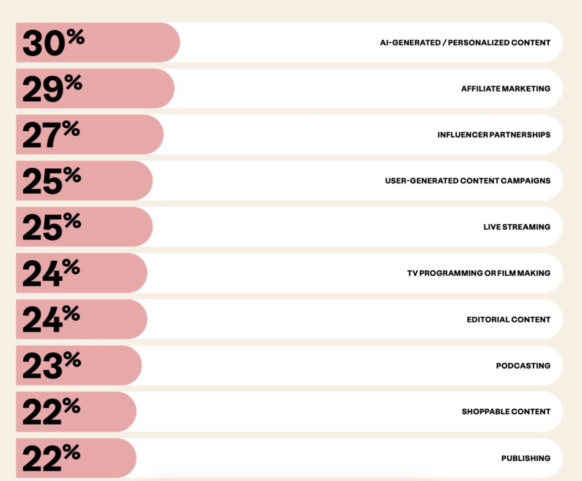 Какие тактики опрошенные использовали для бренд-билдинга через культуру. Сверху вниз (на розовом фоне — процент опрошенных, использовавших данную тактику): ИИ-генерированный/персонализированный контент; партнерский маркетинг; партнерство с инфлюенсерами; кампании по созданию контента пользователями; стриминг в прямом эфире; создание телепередач и фильмов; редакционный контент; подкасты; контент для покупок; печатная продукция.